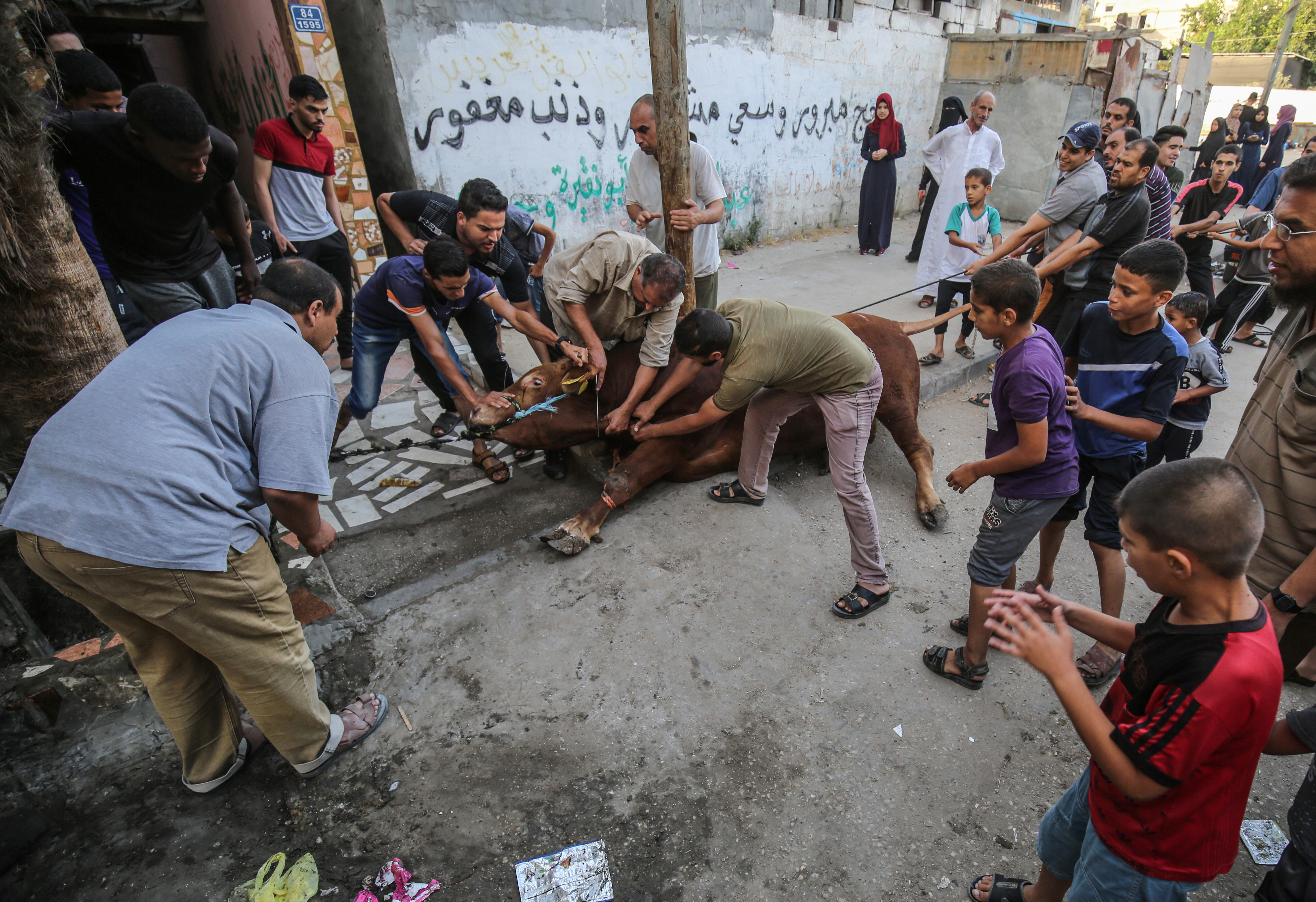 На Курбан-байрам принято закалывать жертвенных животных. Пока мужчины готовят скот, женщины наблюдают за процессом.
